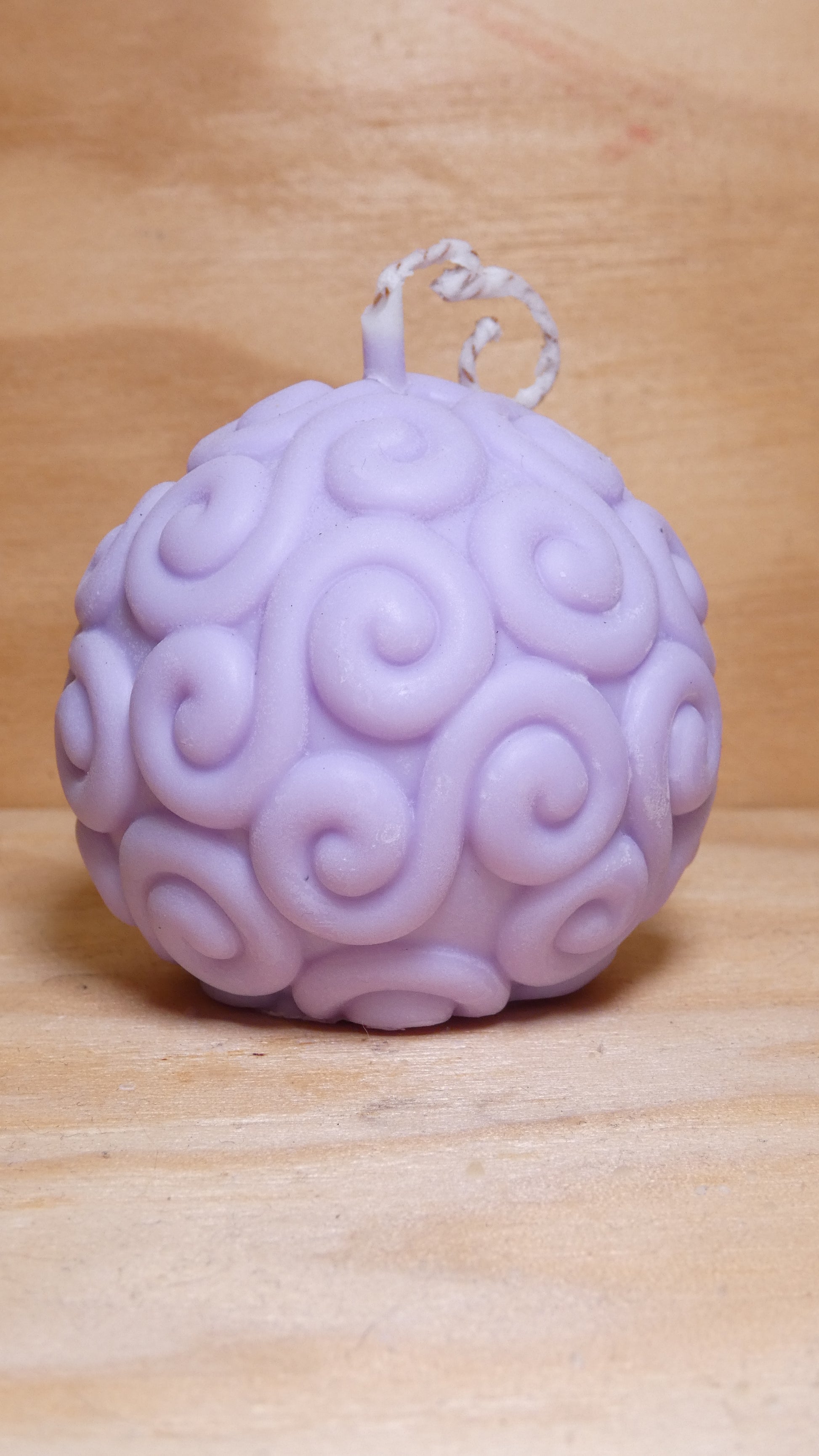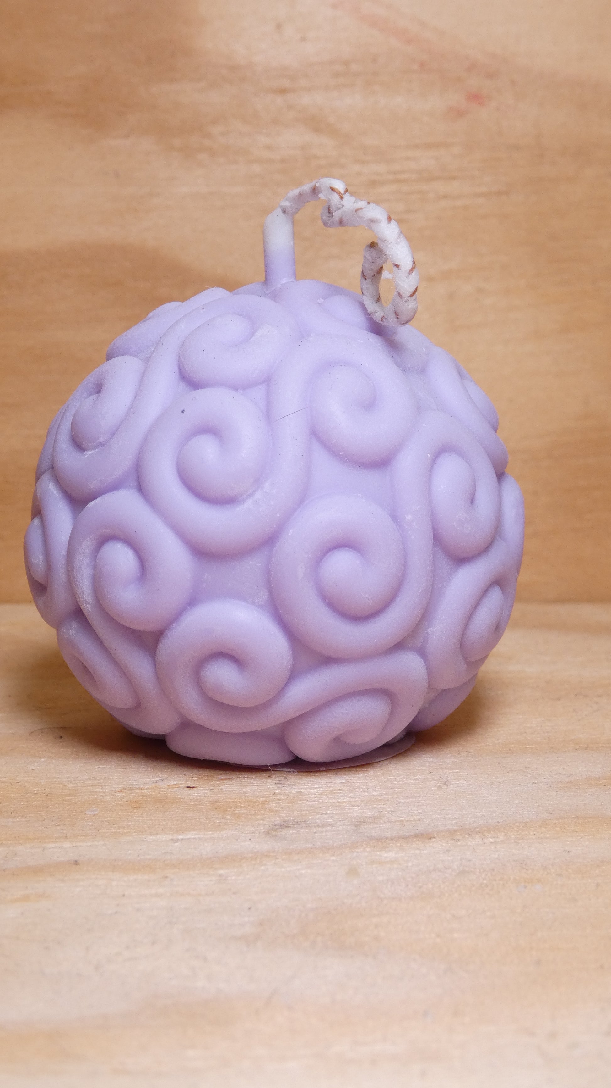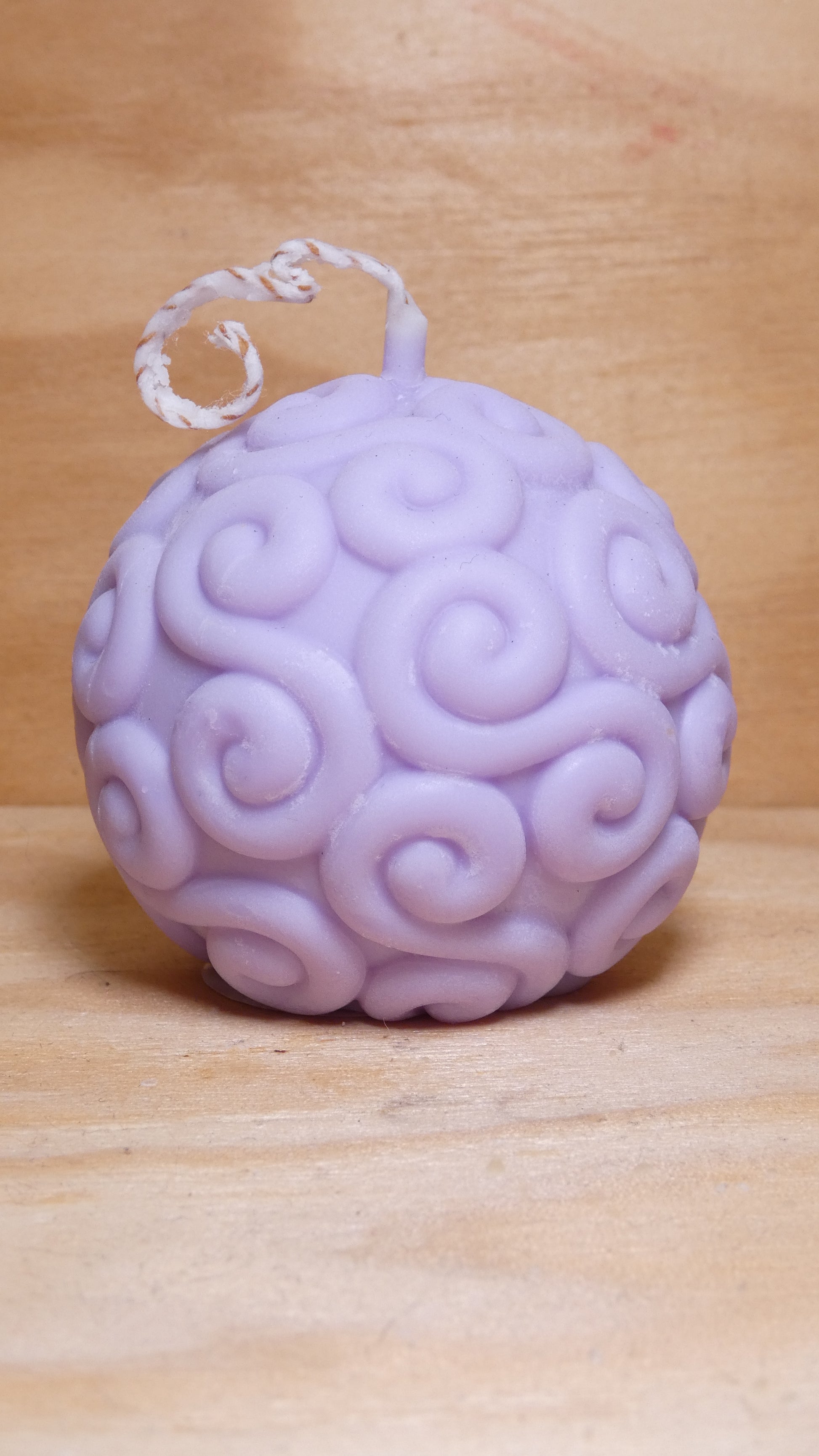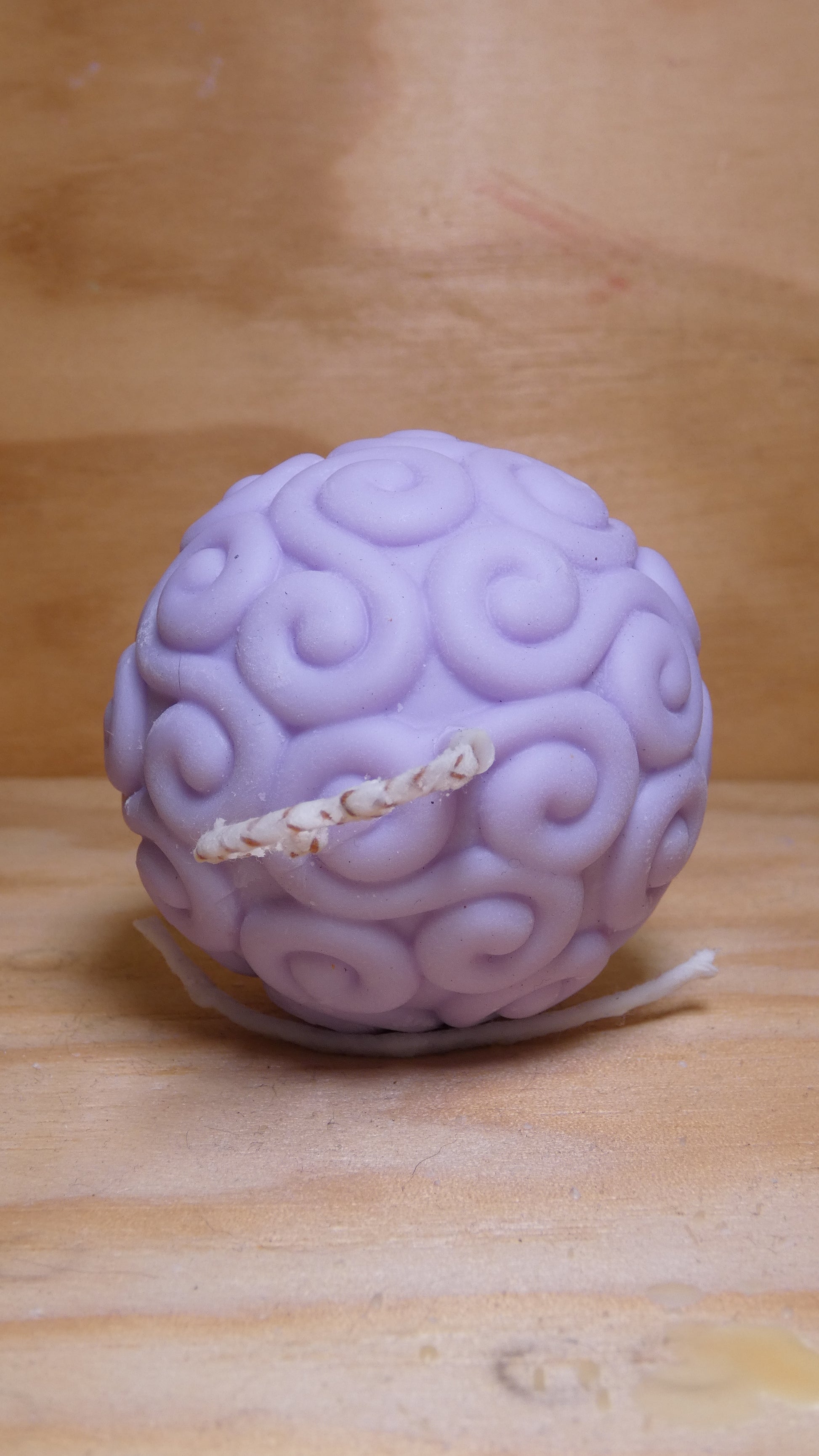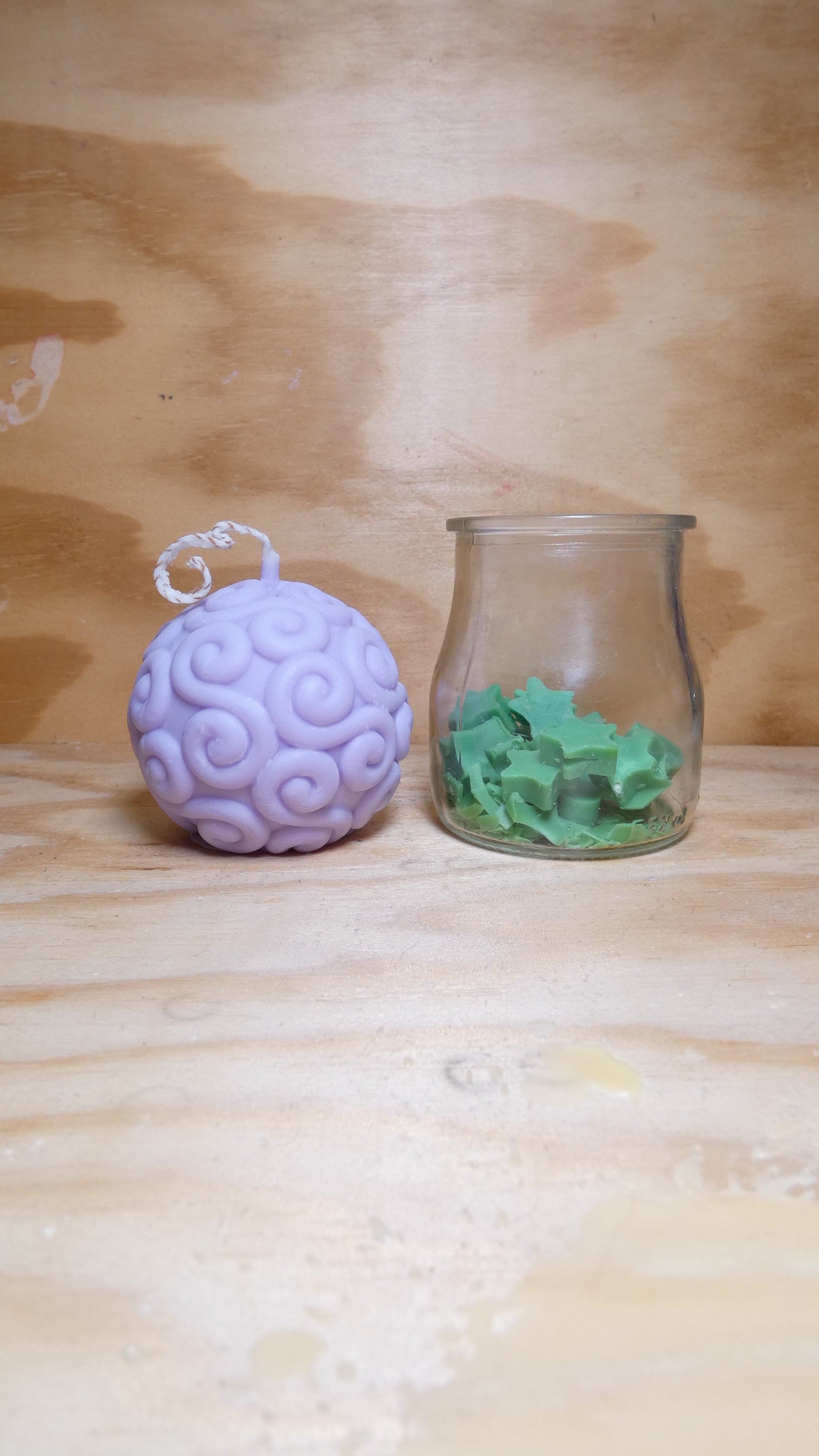 Espelma de cera soja inspirada en la fruita Gomu Gomu i tenyida de lila.