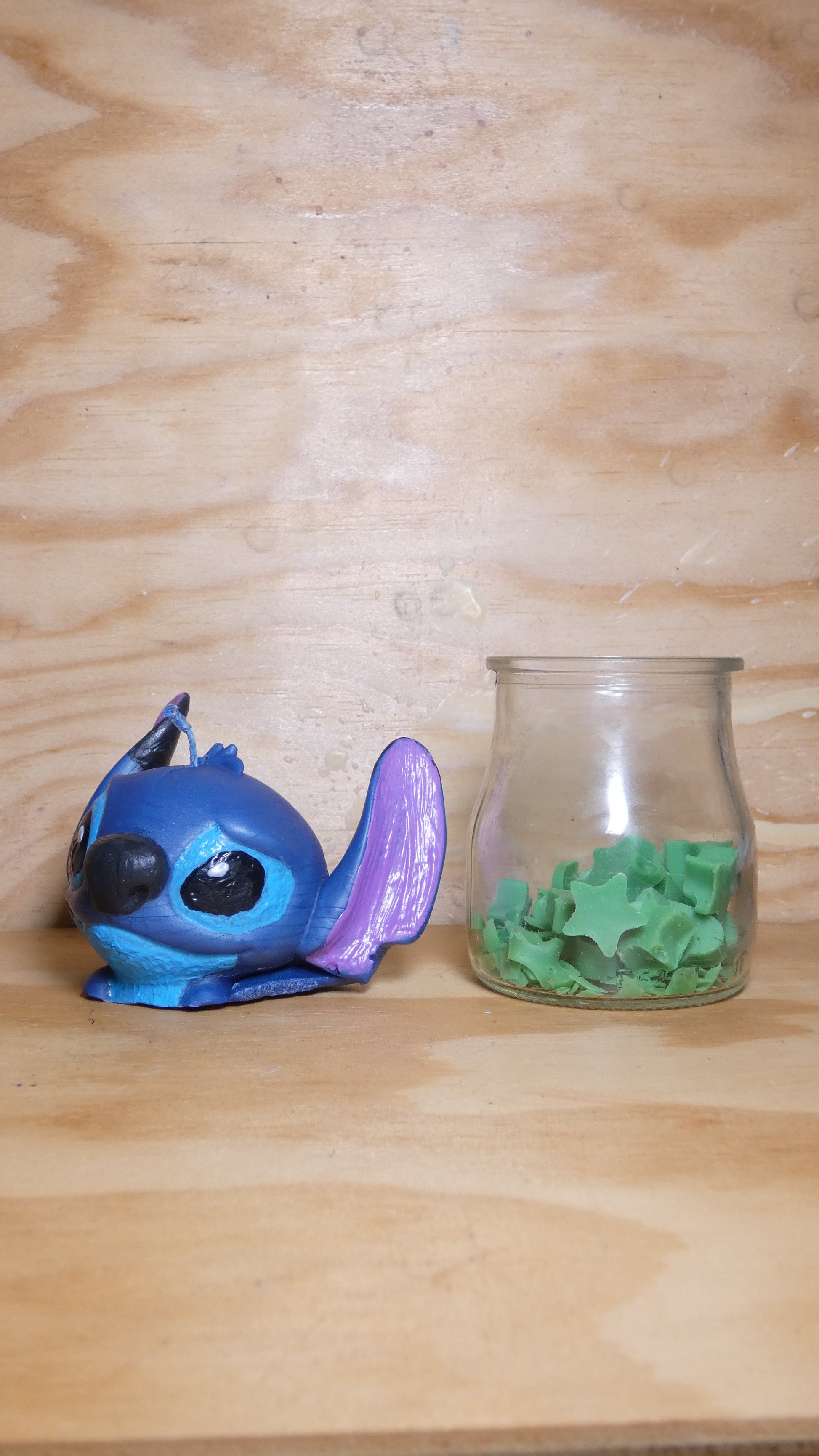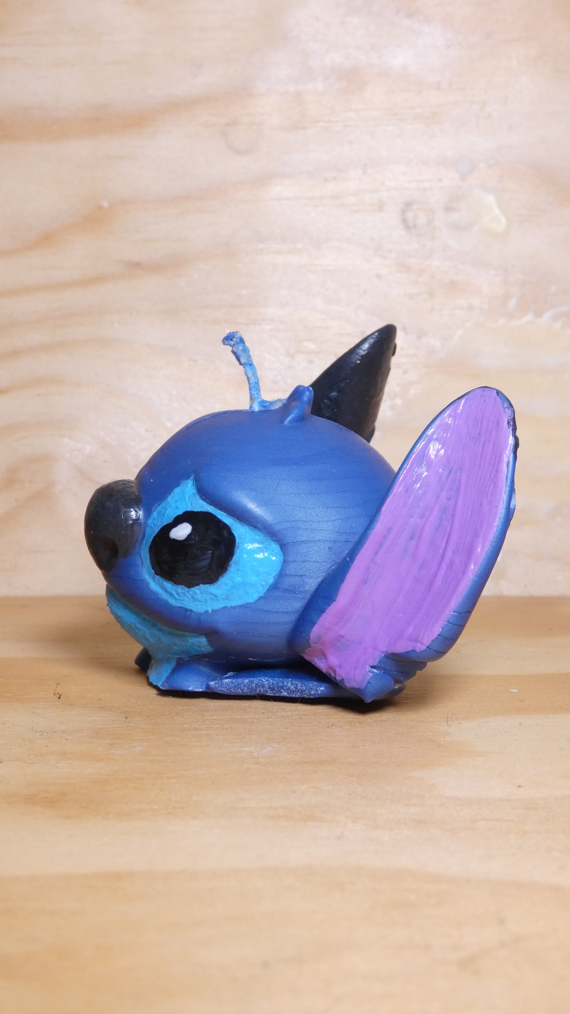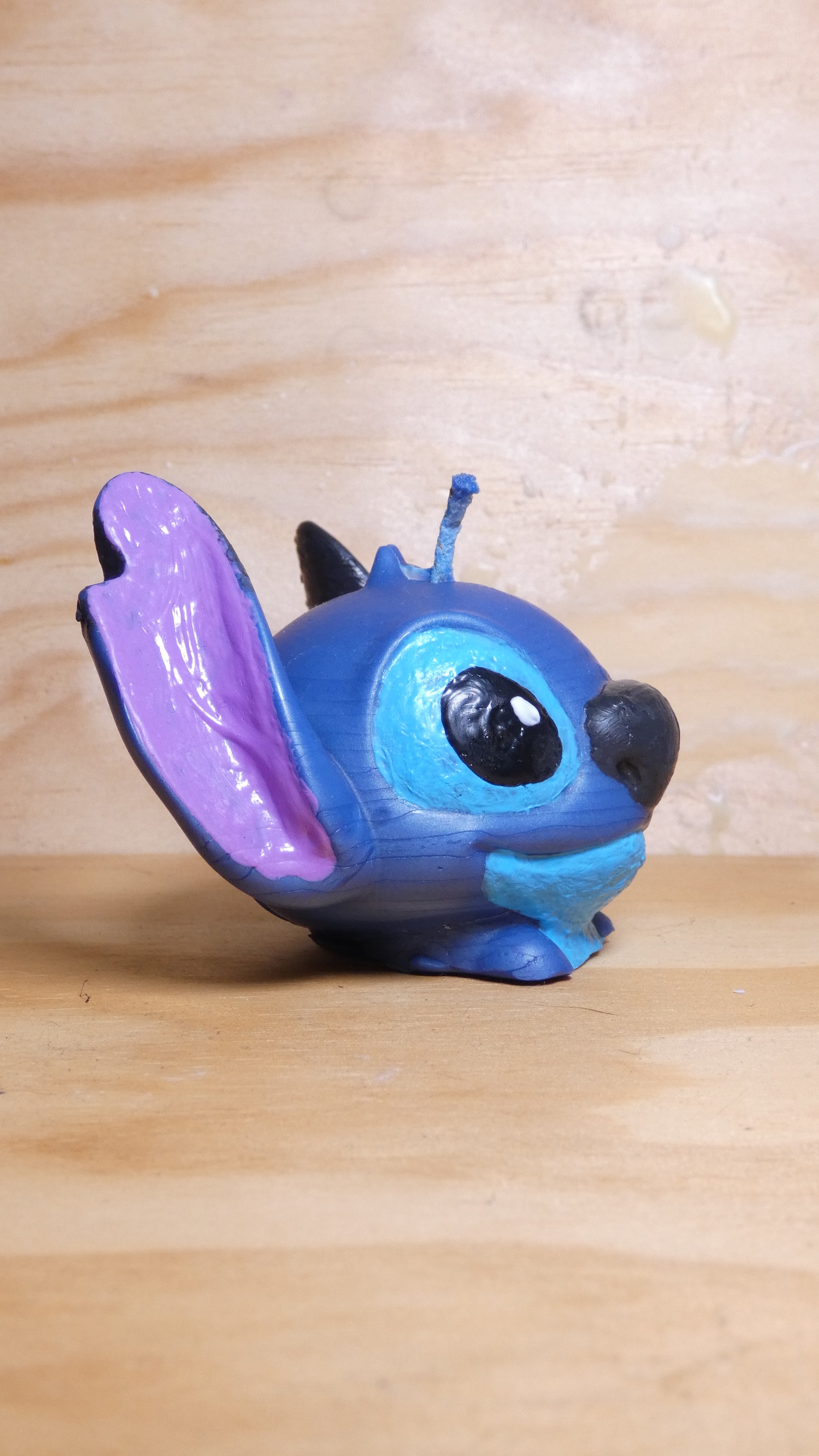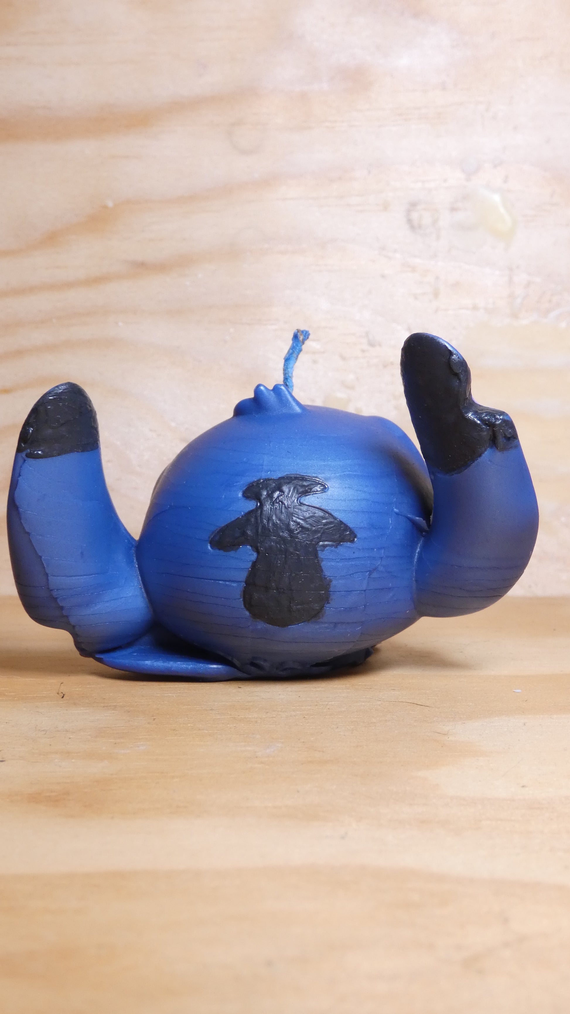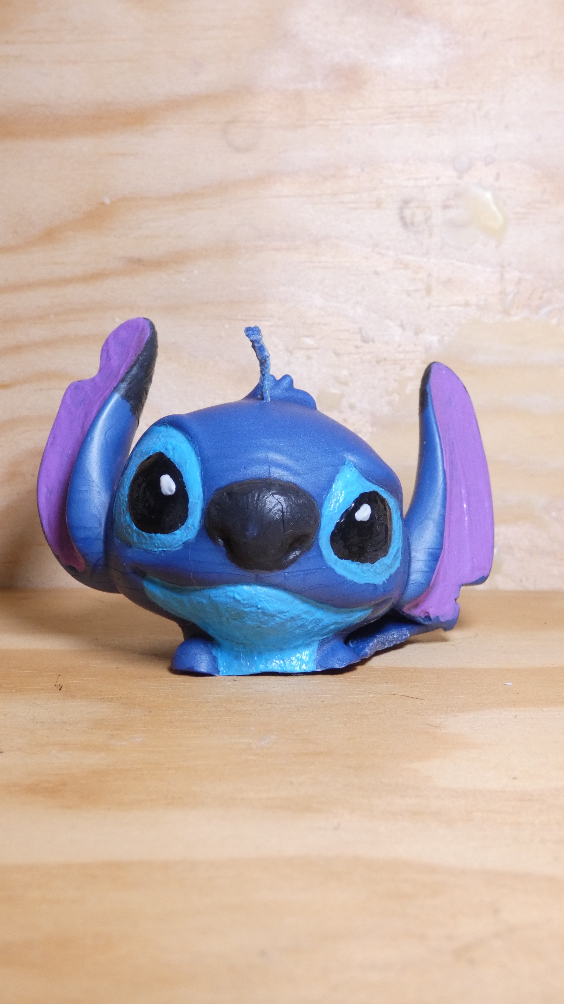 Espelma inspirada en el personatge de l'Stitch, de cera d'arròs pintada a mà.