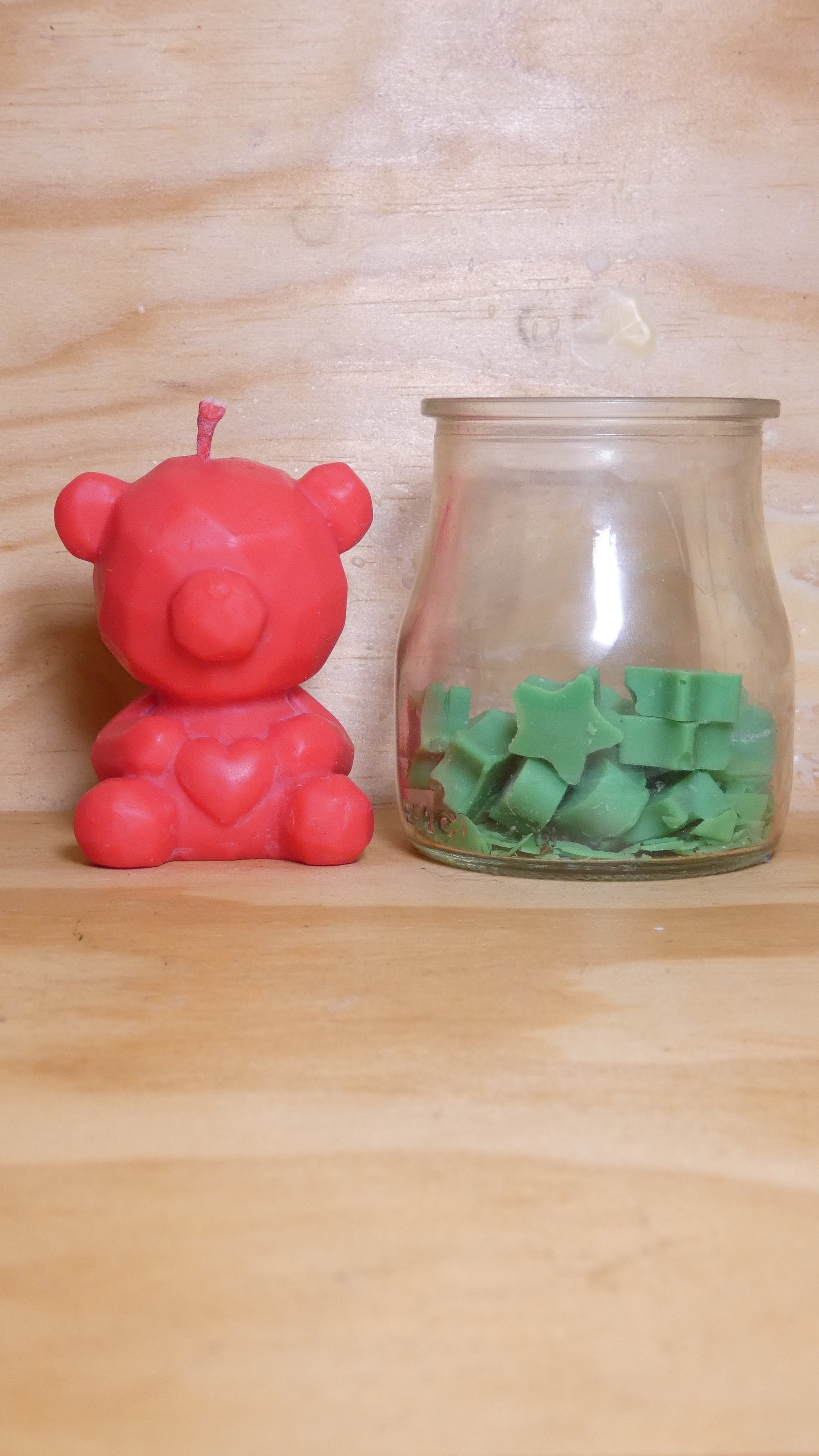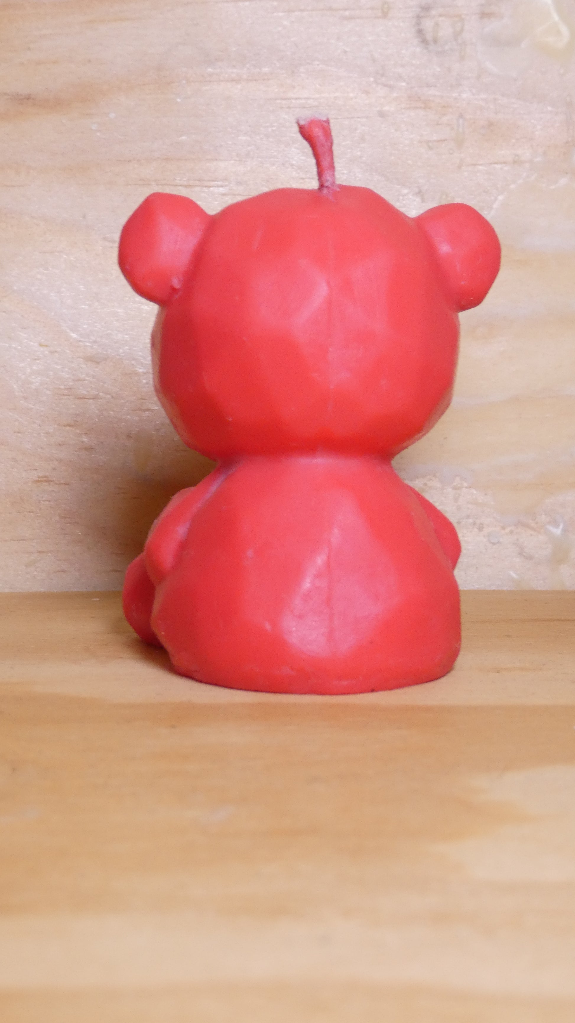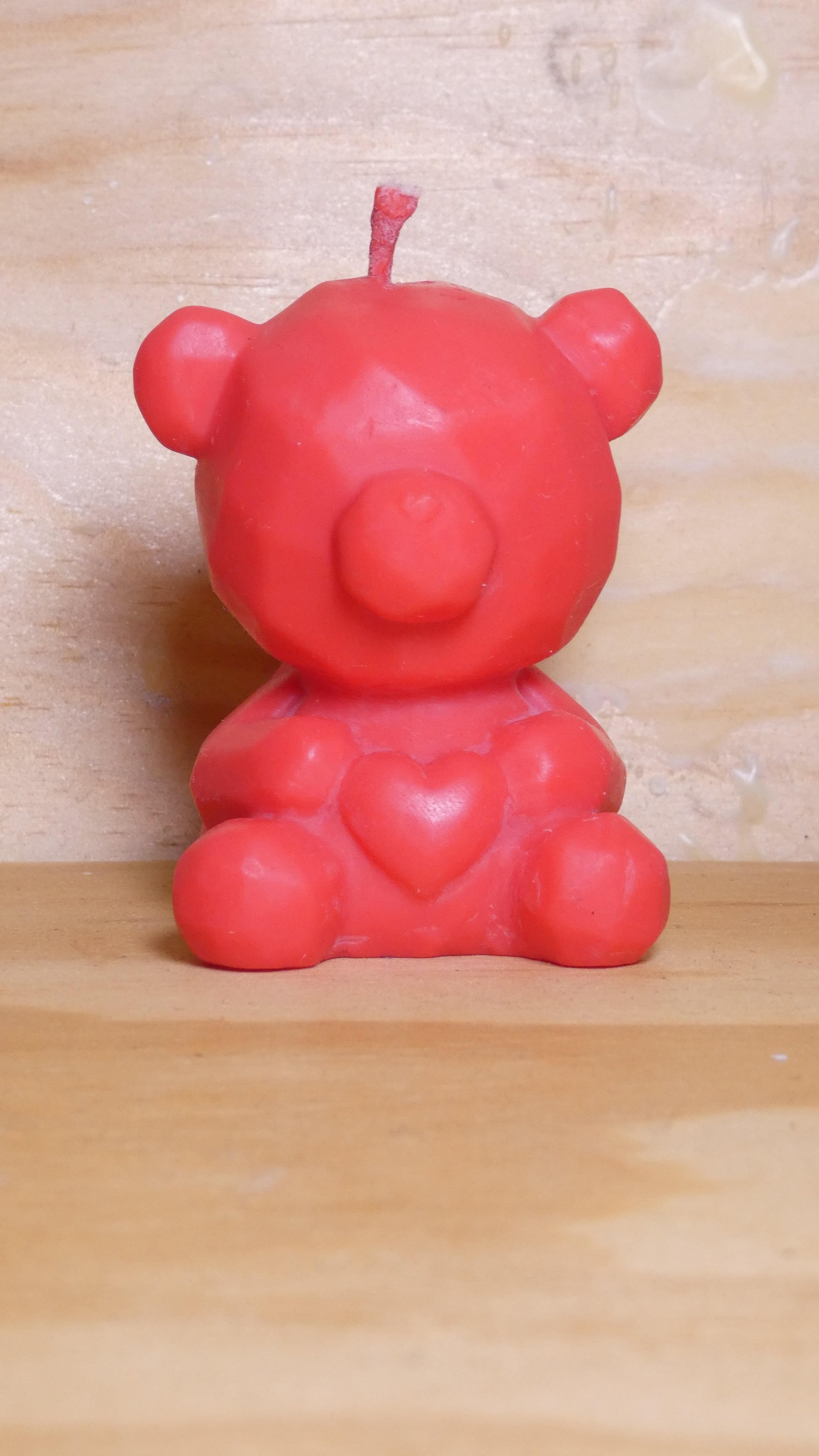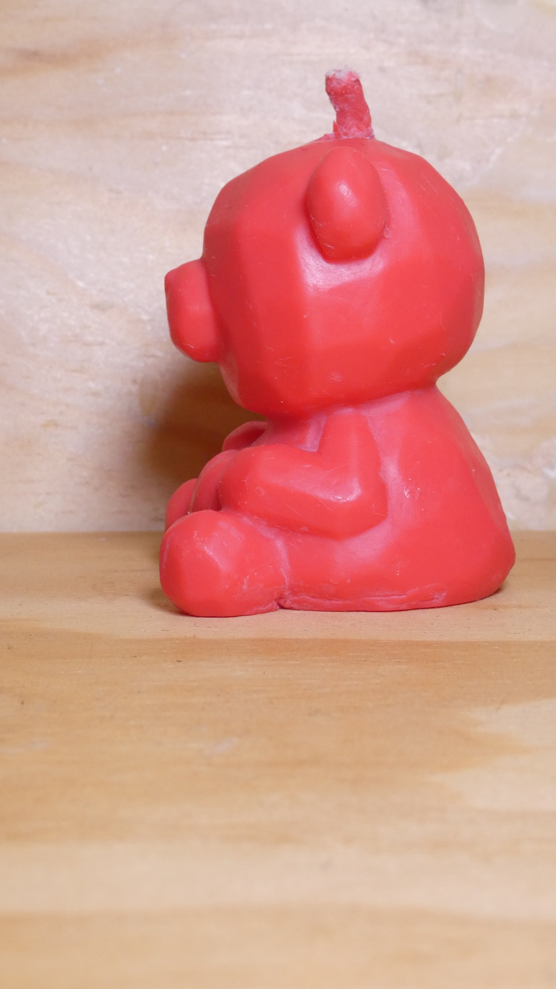Espelma de cera soja en forma d'osset amb cor tenyida de color vermell.