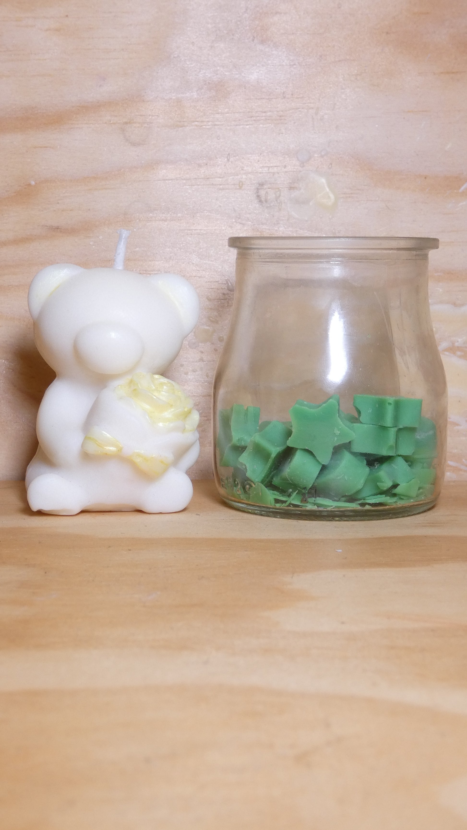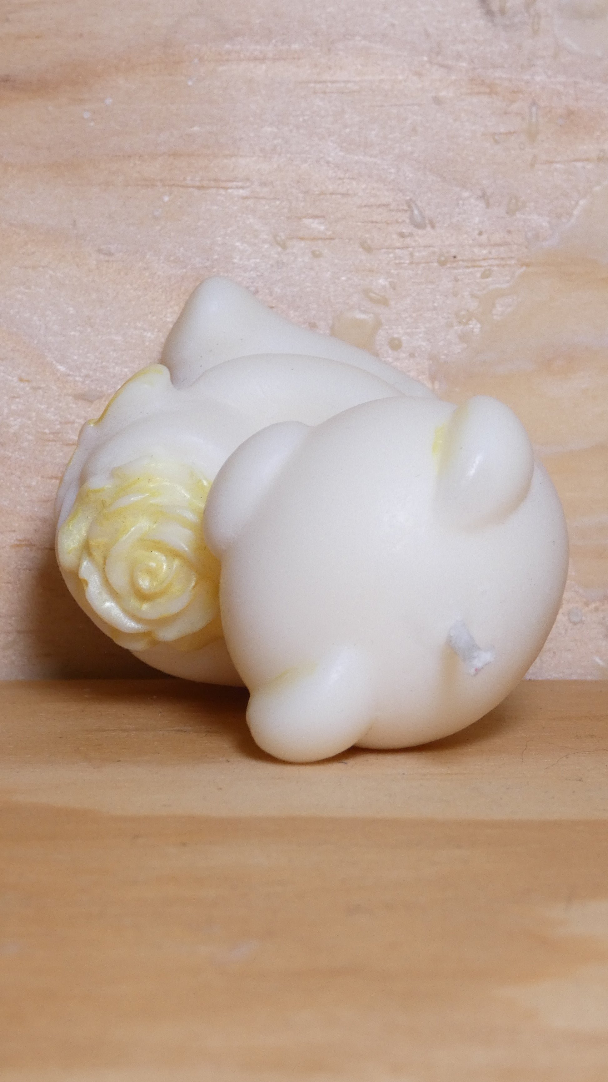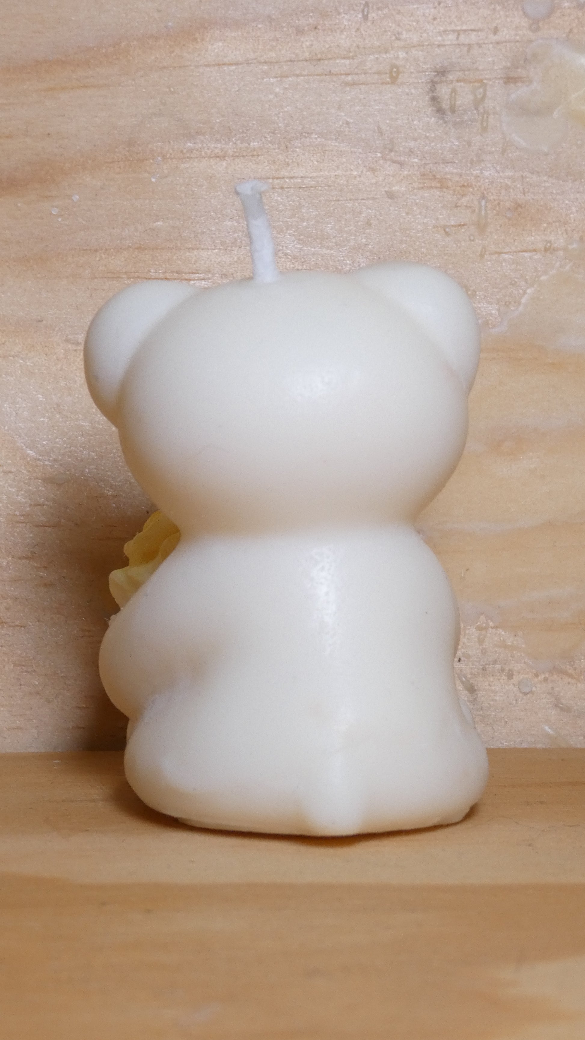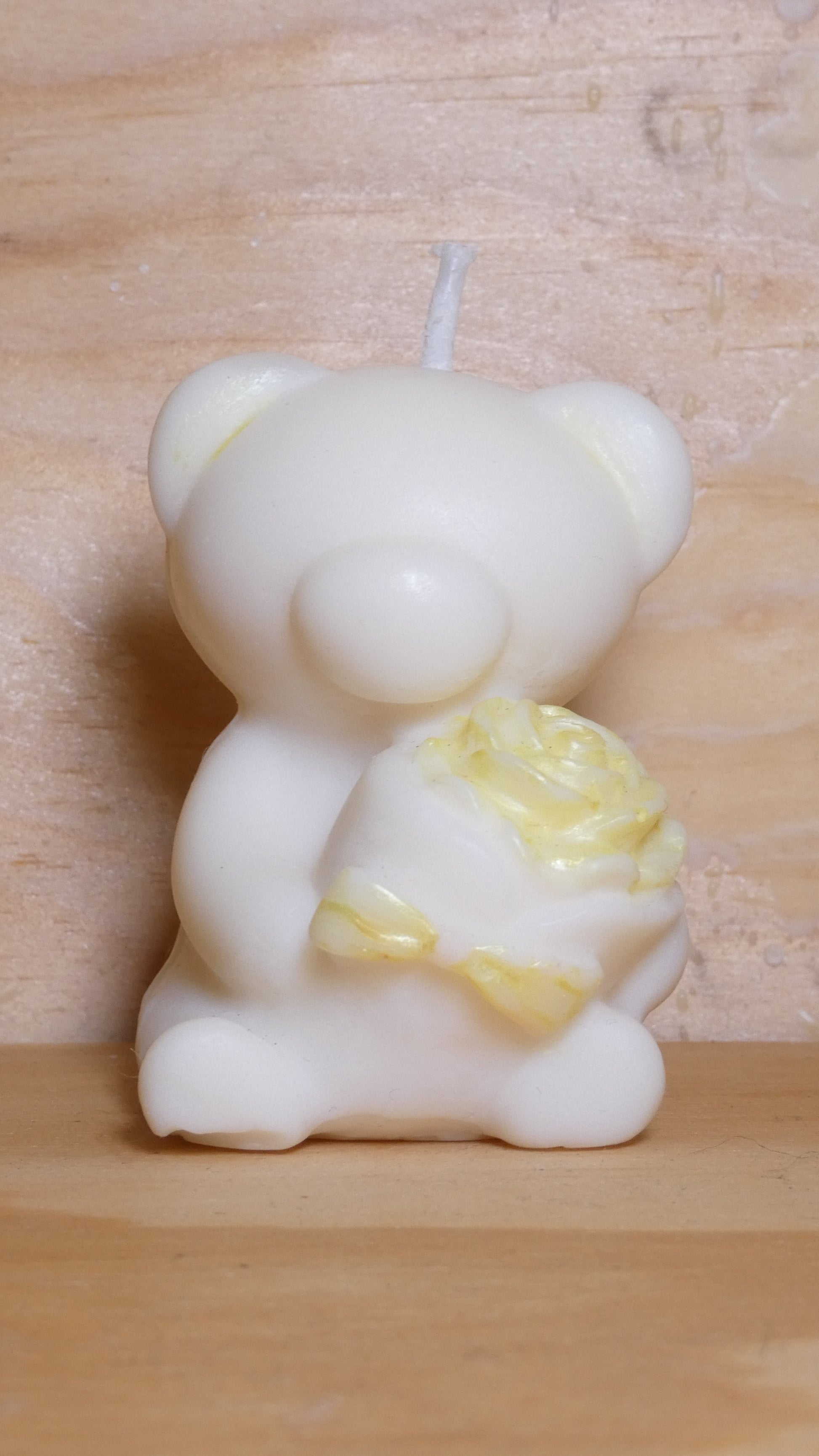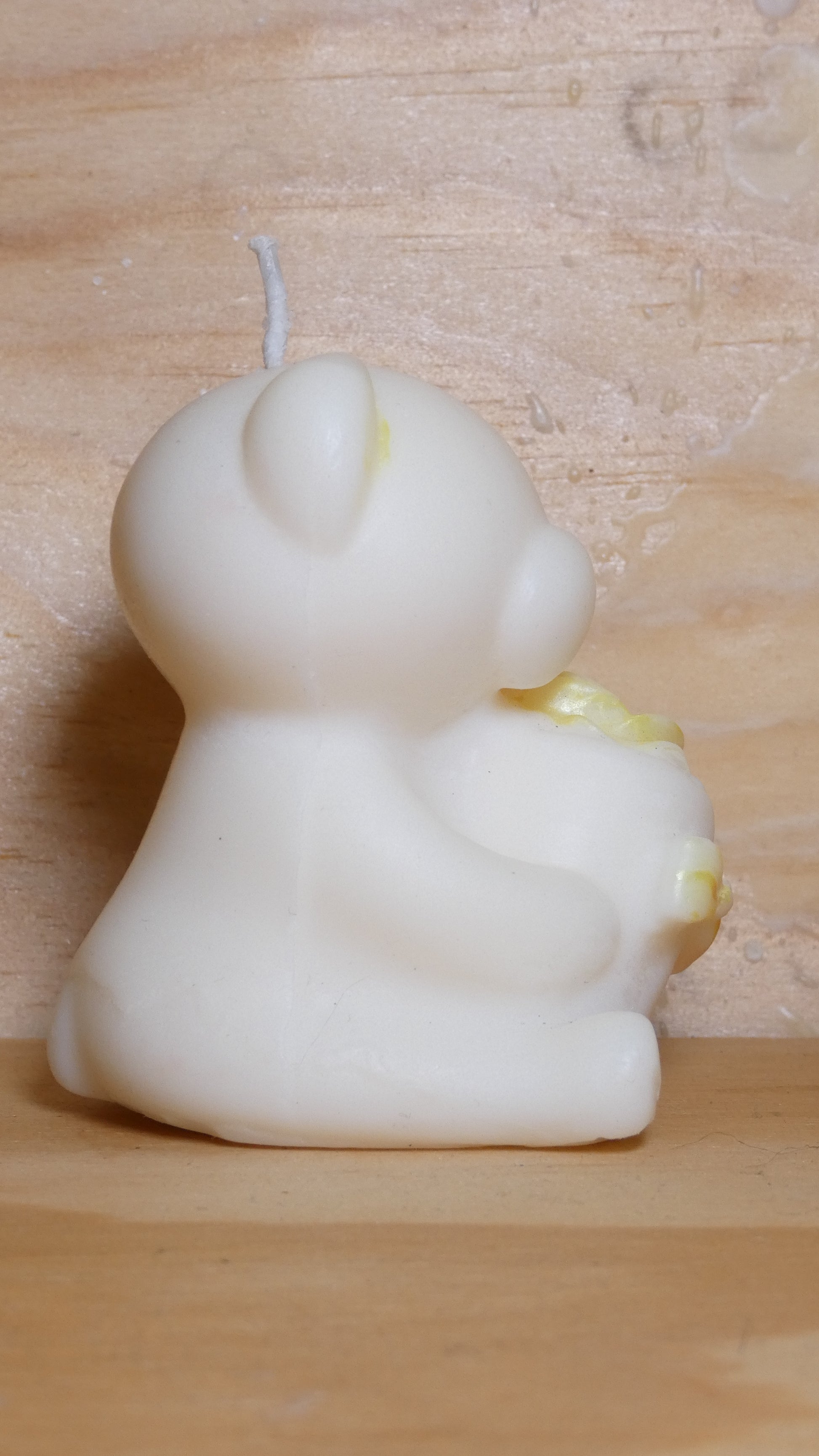 Espelma de cera soja en forma d'osset amb rosa blanca i pintada de groc.