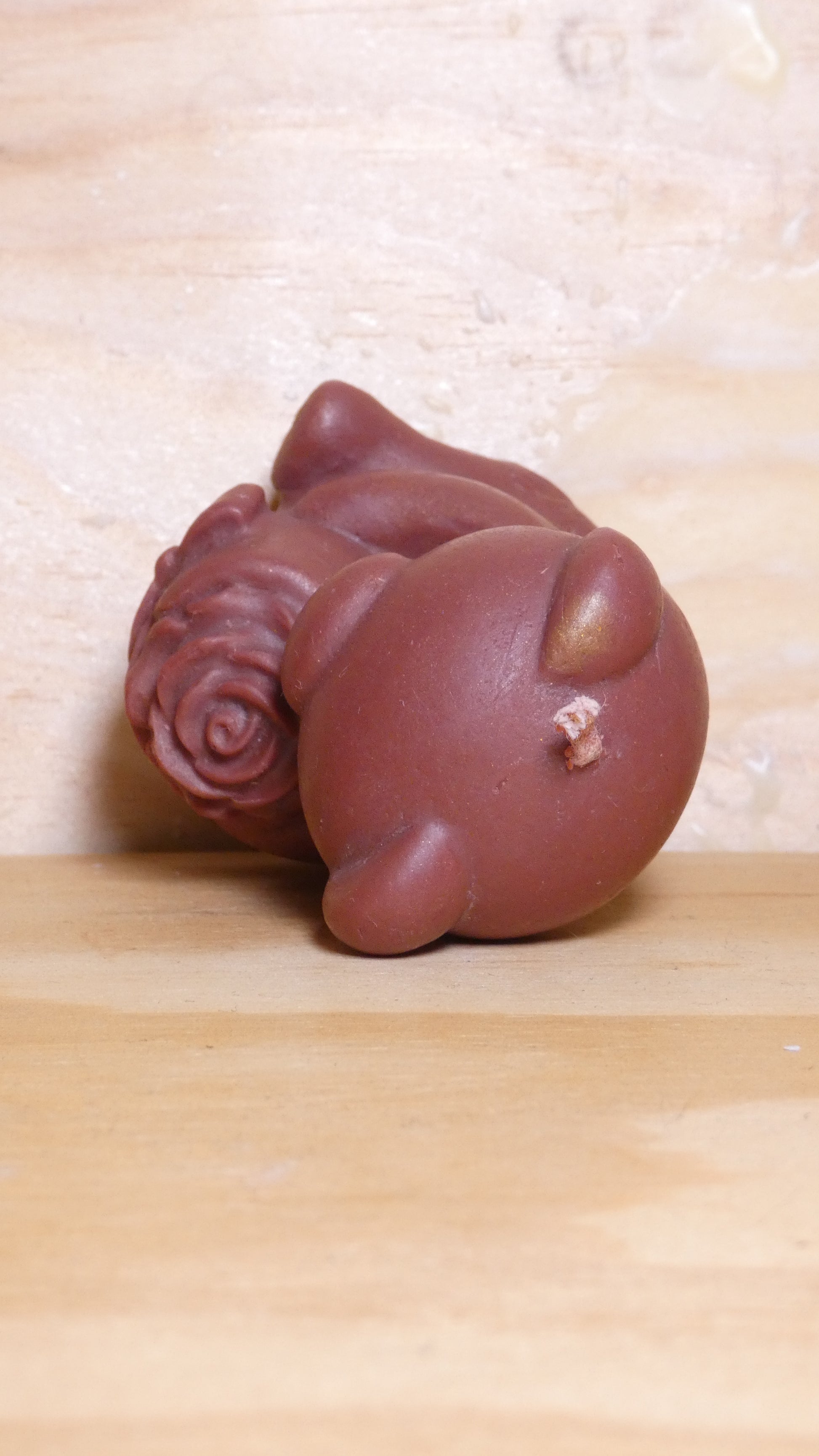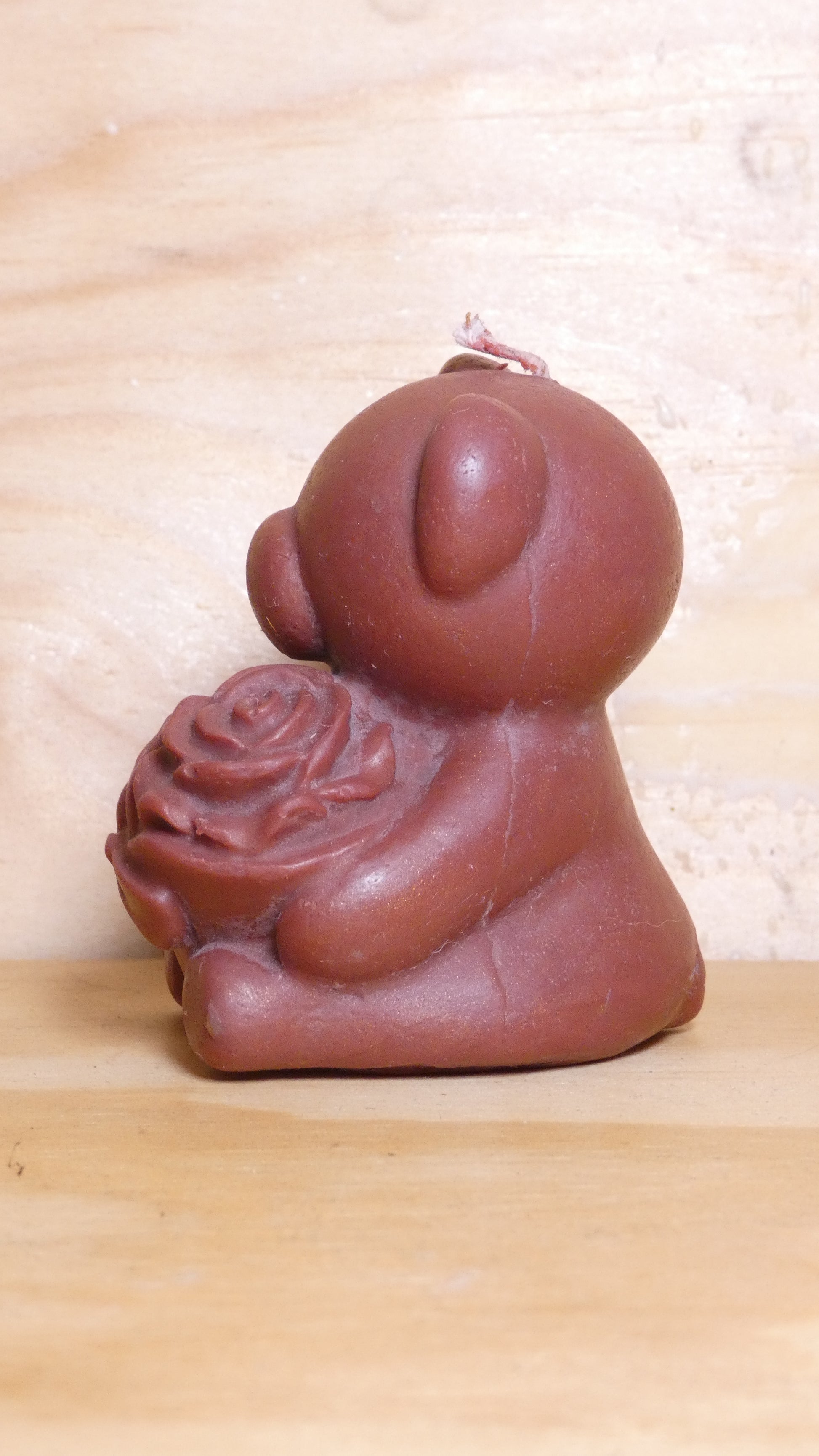 Espelma de cera soja en forma d'osset amb rosa tenyit de marró.