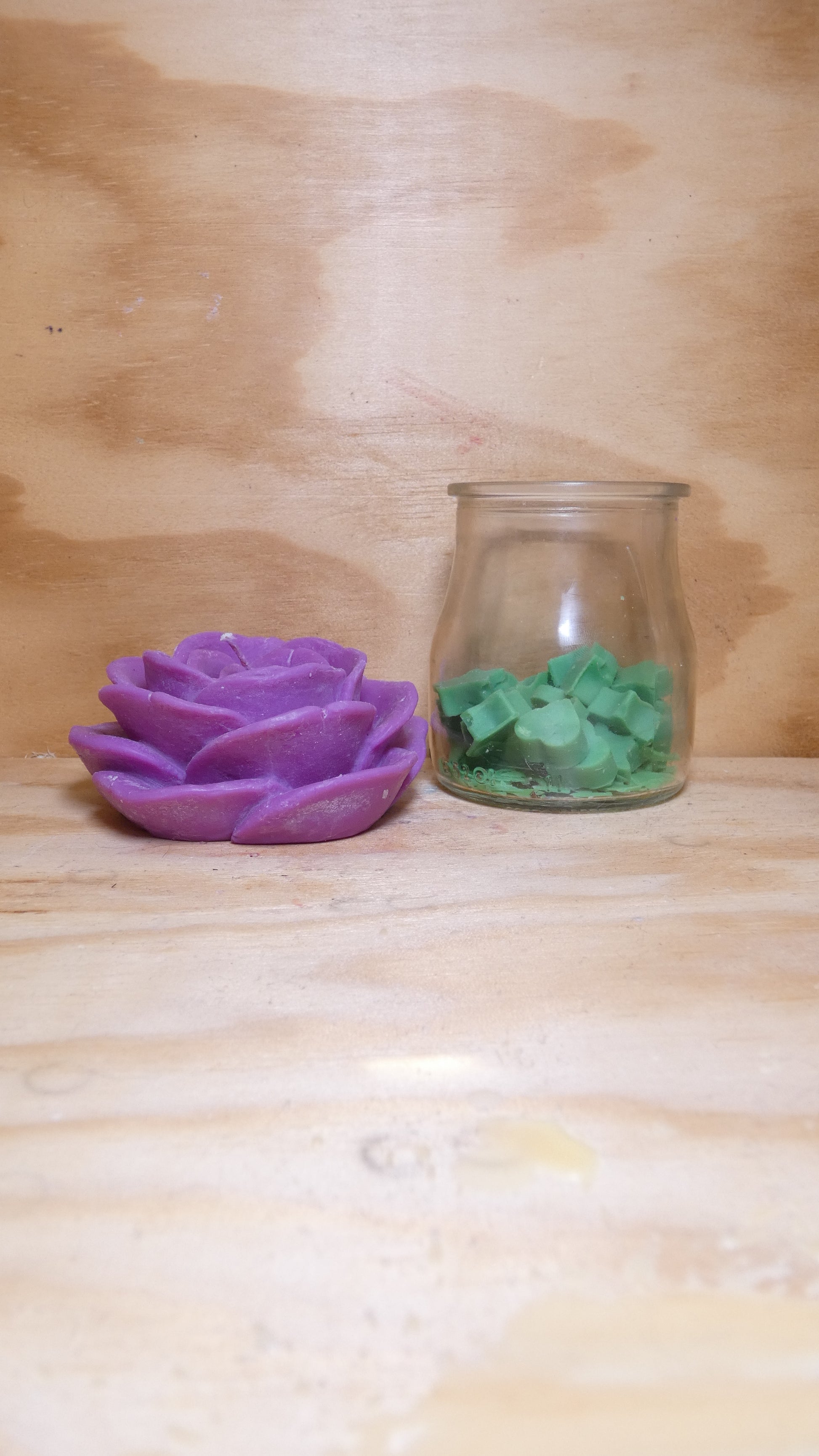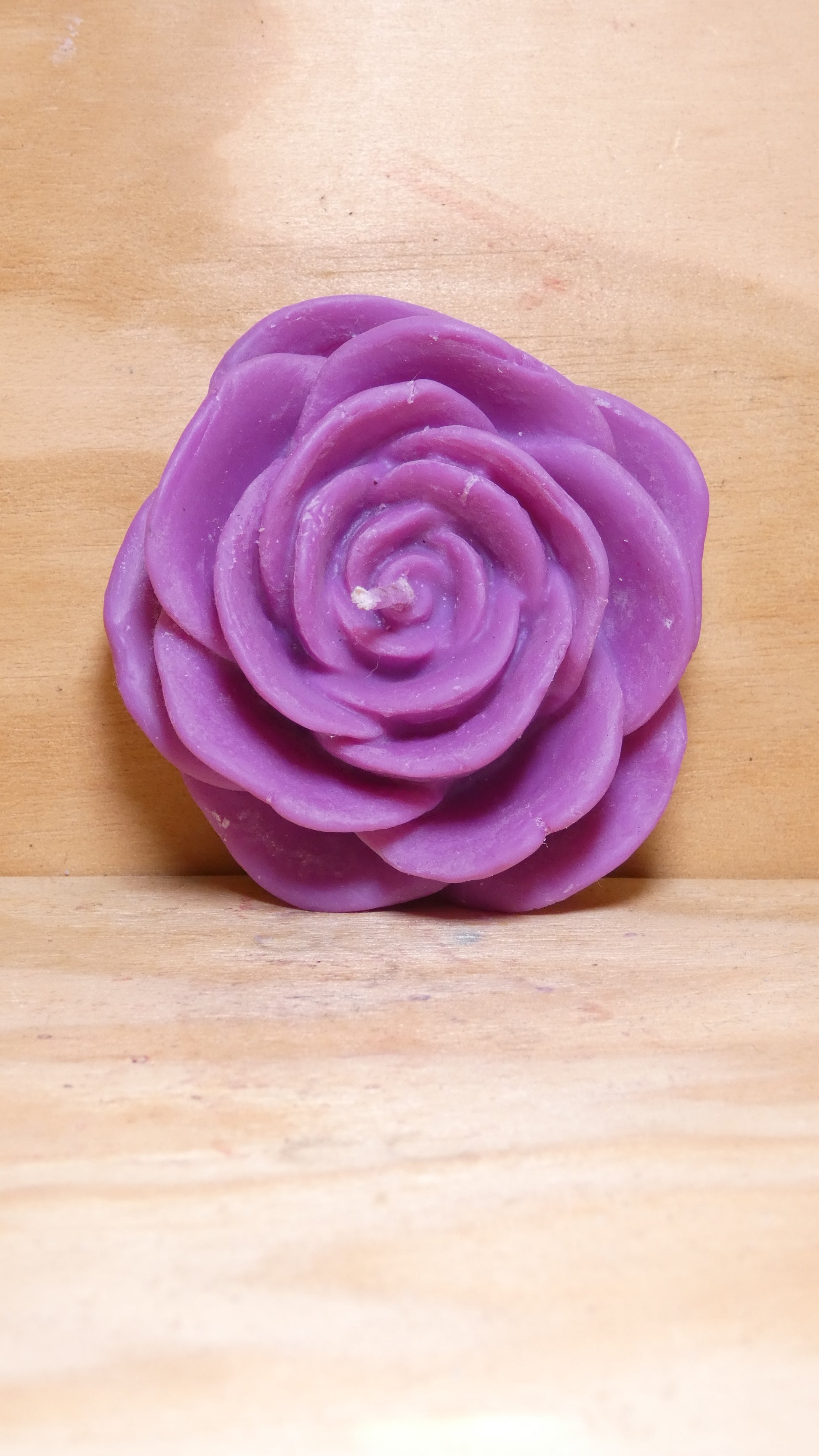 Espelma de cera soja en forma de rosa oberta i tenyida de morat.